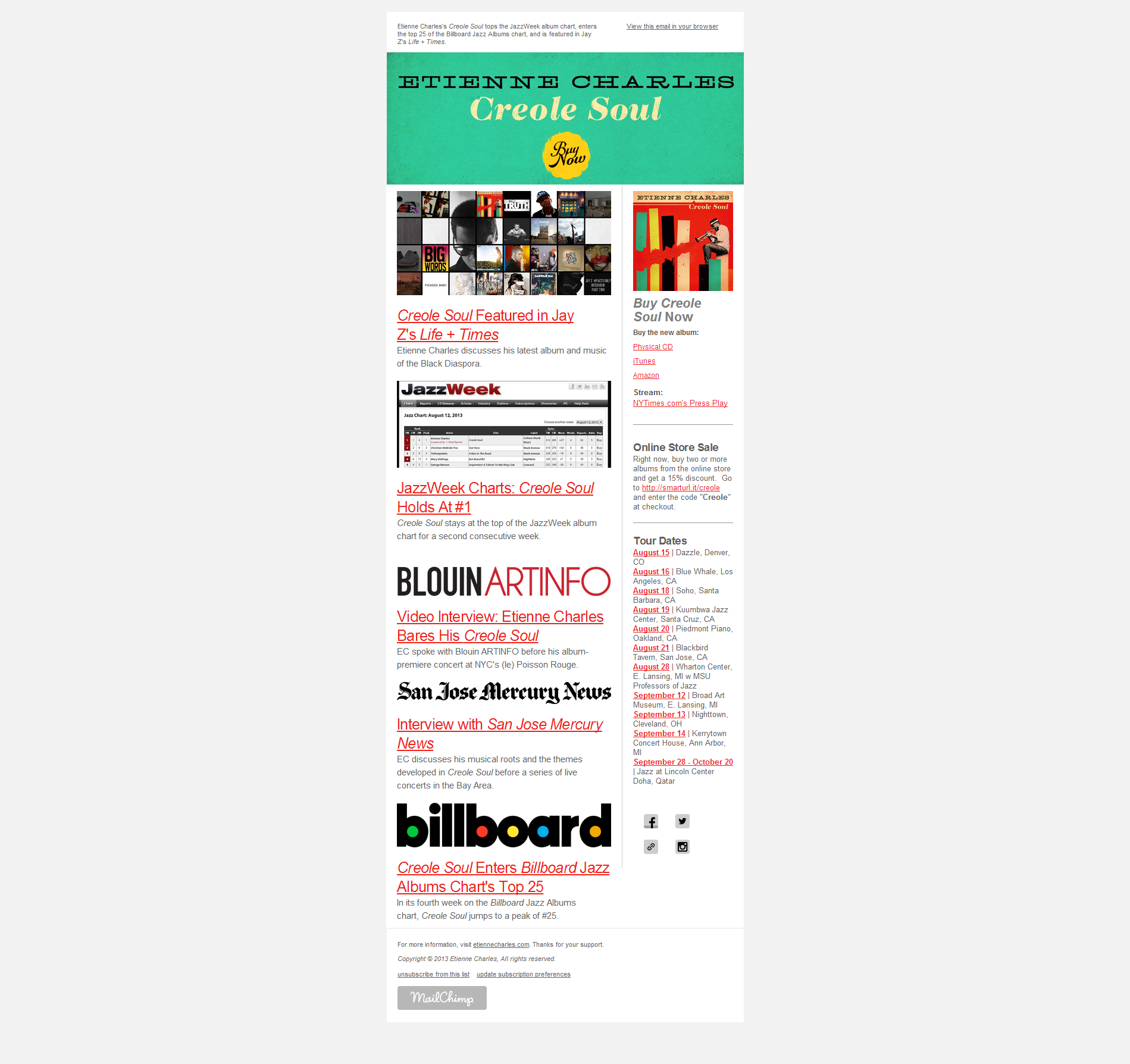 Etienne Charles – August 2013 email newsletter Posted on June 7, 2014 by Kurt August 2013 email newsletter for Etienne Charles.